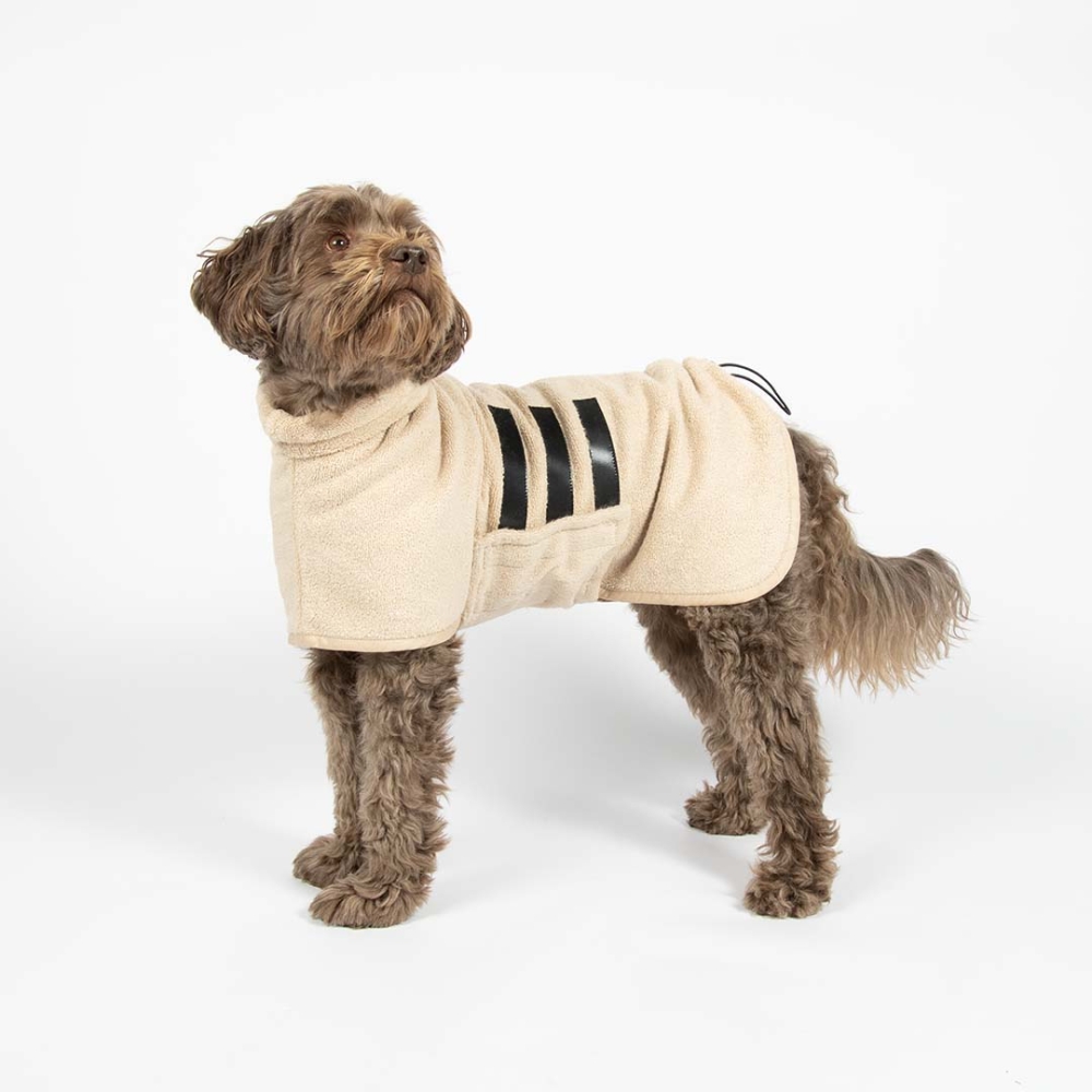 Nach dem Baden, Schwimmen oder einem Spaziergang im Regen hält der Noir Japandi Hundebademantel Ihren Hund warm und trocken. Das weiche, hochsaugfähige Baumwollmaterial nimmt Feuchtigkeit effizient auf und hilft dem Fell, schneller zu trocknen. Der Bademantel bietet eine bequeme Passform mit verstellbarem Anti-Haar-Klettverschluss, wodurch er leicht an- und auszuziehen ist. Erhältlich im stilvollen beigen Japandi-Look.