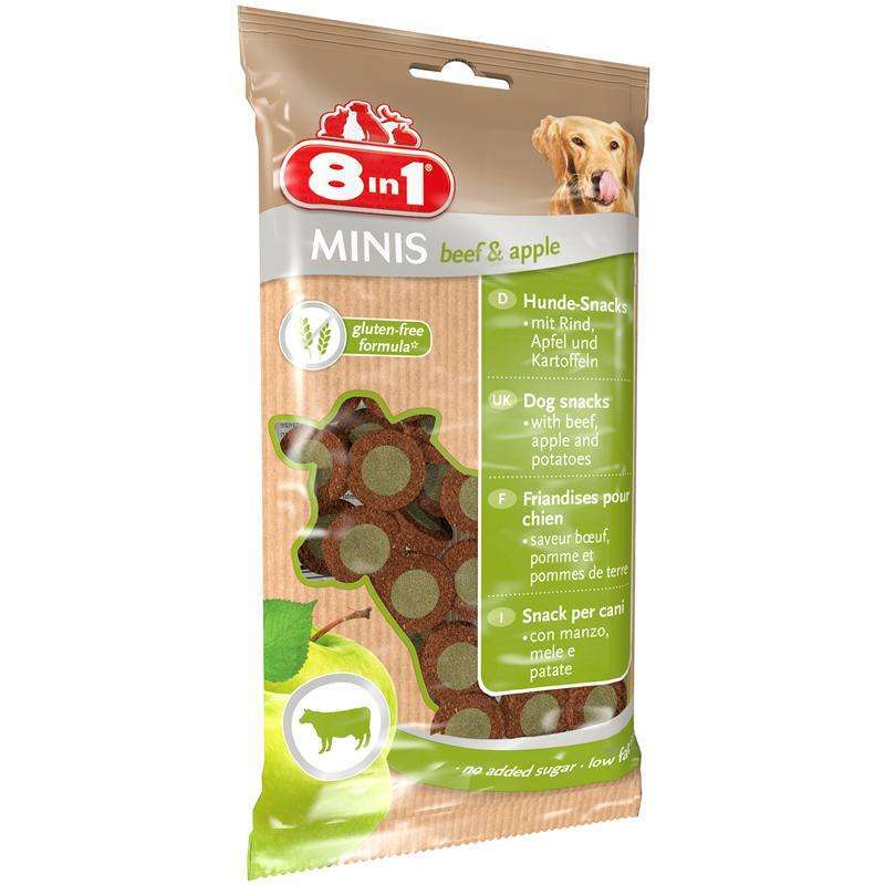 8in1 Minis beef & apple sind leckere Snacks mit Rind und Apfel Die schmackhafte Rezeptur mit Kartoffeln enthält kein glutenhaltiges Getreide. Angereichert mit wertvollen Vitaminen, fettarm und ohne Zusatz von Zucker. Zur gesunden Belohnung für Ihren Hund!