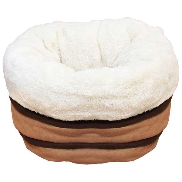 Das Bettchen hat eine Außenseite in Veloursleder-Optik und ist innen mit extra weichem Plüsch bezogen.