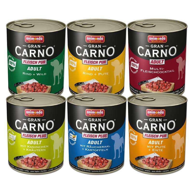 Mixpack mit sechs verschiedenen Sorten, natürlich ohne Zucker und Soja, frei von Geschmacksverstärkern und künstlichen Farb- und Konservierungsstoffen. Sie erhalten je eine GranCarno 800g Dose der Varietäten Multi- Fleischcocktail, Rind + Pute, Rind + Wild, mit Pute + Ente, mit Räucheraal + Kartoffeln und mit Kaninchen + Kräuter.