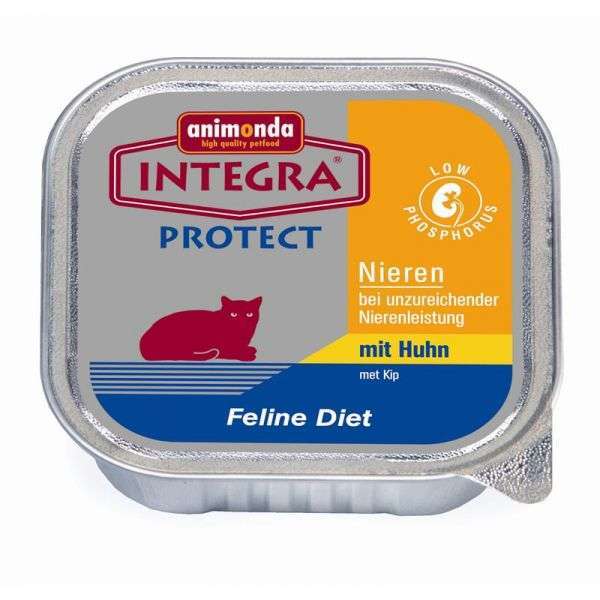 Katzen mit einer eingeschränkten Nierenfunktion (Niereninsuffizienz) benötigen ein spezielles Futter mit einem reduzierten Gehalt an Phosphor und Eiweiß. Typisch für dieses Krankheitsbild ist die verminderte Ausscheidungsfähigkeit u.a. von Phosphor. Das Vermögen der Nieren, bestimmte Endprodukte des Eiweißstoffwechsels auszuscheiden, ist ebenfalls verringert. Zu hohe Eiweißgehalte können daher die Nierenfunktion beeinträchtigen. Die in INTEGRA® PROTECT angebotenen Proteine sind deshalb besonders hochwertig, um trotz des reduzierten Gehaltes den Proteinbedarf der Katze voll abzudecken. Die eingeschränkte Nierentätigkeit macht zudem eine leichte Erhöhung des Gehaltes an Vitamin D3 in INTEGRA® PROTECT Nieren erforderlich. Eine besonders gute Akzeptanz und leichte Verdaulichkeit zeichnen diese Futterzubereitung aus. Im Interesse einer optimalen Versorgung sollten Sie Ihrer Katze die Tagesfutter-Ration möglichst auf 3 Mahlzeiten verteilt anbieten. Speziell bei chronischer Niereninsuffizienz ist es wichtig, die Diätnahrung ausschließlich und lebenslang zu verfüttern. Die Zugabe von normalen Futtermitteln, Tischresten und anderen Ergänzungsfuttermitteln sollte unterbleiben, um Theraphierfolg nicht zu gefährden.