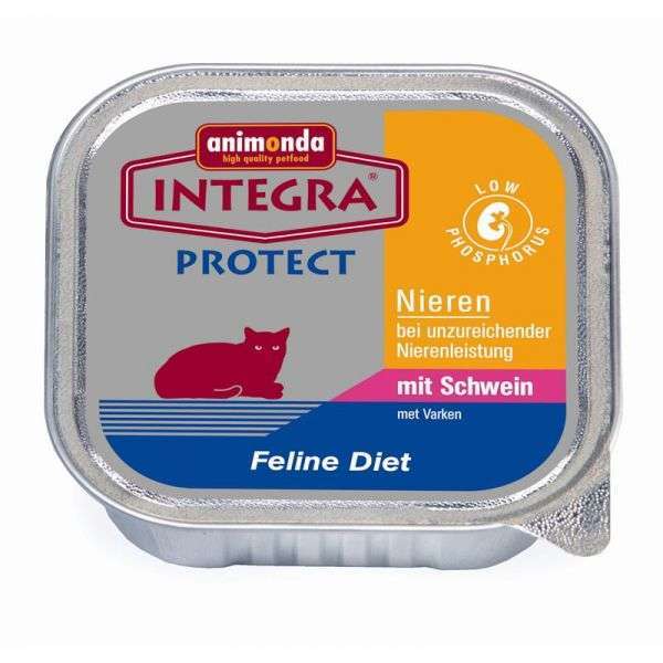 Katzen mit einer eingeschränkten Nierenfunktion (Niereninsuffizienz) benötigen ein spezielles Futter mit einem reduzierten Gehalt an Phosphor und Eiweiß. Typisch für dieses Krankheitsbild ist die verminderte Ausscheidungsfähigkeit u.a. von Phosphor. Das Vermögen der Nieren, bestimmte Endprodukte des Eiweißstoffwechsels auszuscheiden, ist ebenfalls verringert. Zu hohe Eiweißgehalte können daher die Nierenfunktion beeinträchtigen. Die in INTEGRA® PROTECT angebotenen Proteine sind deshalb besonders hochwertig, um trotz des reduzierten Gehaltes den Proteinbedarf der Katze voll abzudecken. Die eingeschränkte Nierentätigkeit macht zudem eine leichte Erhöhung des Gehaltes an Vitamin D3 in INTEGRA® PROTECT Nieren erforderlich. Eine besonders gute Akzeptanz und leichte Verdaulichkeit zeichnen diese Futterzubereitung aus. Im Interesse einer optimalen Versorgung sollten Sie Ihrer Katze die Tagesfutter-Ration möglichst auf 3 Mahlzeiten verteilt anbieten. Speziell bei chronischer Niereninsuffizienz ist es wichtig, die Diätnahrung ausschließlich und lebenslang zu verfüttern. Die Zugabe von normalen Futtermitteln, Tischresten und anderen Ergänzungsfuttermitteln sollte unterbleiben, um Theraphieerfolg nicht zu gefährden.