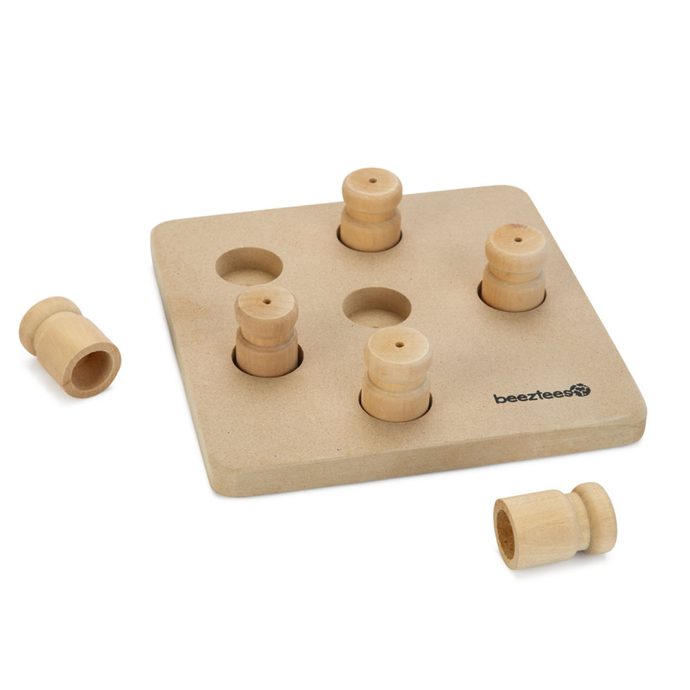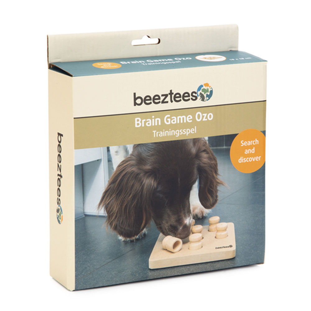 Das Beeztees Braingame Ozo fordert deinen Hund auf spielerische Weise physisch und mental heraus, da er hier auf der Suche nach den versteckten Snacks verschiedene "Hürden" überwinden muss. Verstecke einen oder mehrere Snacks in den Vertiefungen des Spielzeugs und stelle die Holz-Hütchen darüber. Um an die Leckereien heran kommen zu können, muss dein Hund nun die Hütchen entfernen.