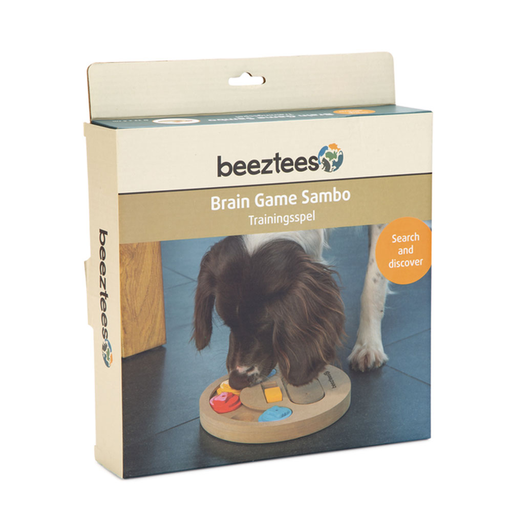 Das Beeztees Brain Game Sambo fordert deinen Welpen auf spielerische Weise physisch und mental heraus, da er hier auf der Suche nach den versteckten Snacks verschiedene "Hürden" überwinden muss. In den speziell dafür vorgesehenen Vertiefungen werden ein oder mehrere Snacks versteckt. Für deinen Welpen gibt es nun zwei Möglichkeiten, an die Snacks heran zu kommen, zum Einen, in dem er das rote Element entfernt, so dass die farbigen Schieber, unter denen sich ein leckerer Snack befindet, bewegt werden können. Zum anderen kann dein Welpe auch den gelben Block verschieben, wodurch sich die Holzabdeckung bewegt. Wenn du jedes Mal andere Verstecke für die Snacks wählst, bleibt das Spiel für deinen Hund spannend und interessant.