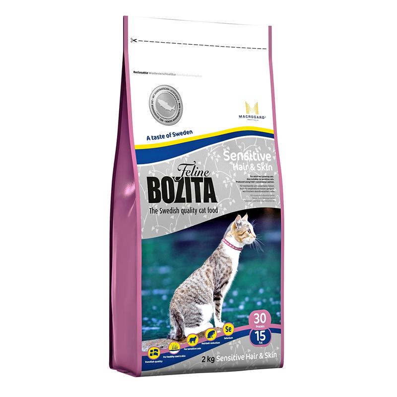 Bozita Feline Sensitive Hair & Skin ist ein komplett ausgewogenes Alleinfutter für wachsende und erwachsene Katzen. Das Futter ist besonders auf die Bedürfnisse von Langhaarkatzen und Katzen mit Haut- und Fellproblemen angepasst.