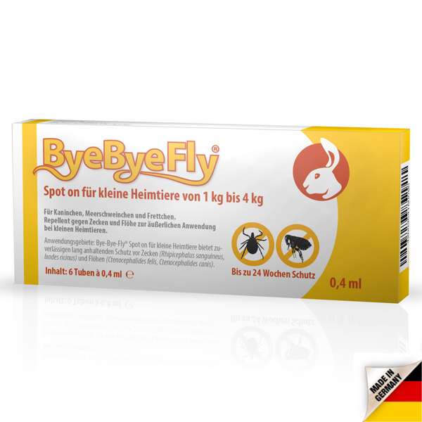 ByeByeFly® Spot on schützt bis zu 4 Wochen vor Zecken (Rhipicephalus sanguineus, Ixodes ricinus) und Flöhen (Ctenocephalides felis, Ctenocephalides canis).