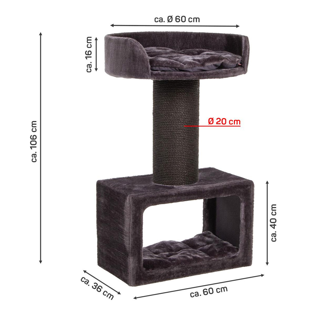 Bei einer Höhe von ca. 106 cm befindet sich das Kuschelbett auf einer angenehmen Position, um mit den Stubentigern sowohl im Sitzen als auch im Stehen zu interagieren. Der Kratzbaum kann praktisch auch neben dem Sofa platziert werden, sodass Ihr Liebling auf Augenhöhe mit Ihnen gemütlich verweilen kann. Auf der runden Liegefläche, welche ein Maß von ca. Ø 60 cm aufweist, befindet sich zudem ein komfortables Kissen. Der Kratzbaum eignet sich demnach prima zum Spielen, verstecken und auch zum kuscheln und schlafen.