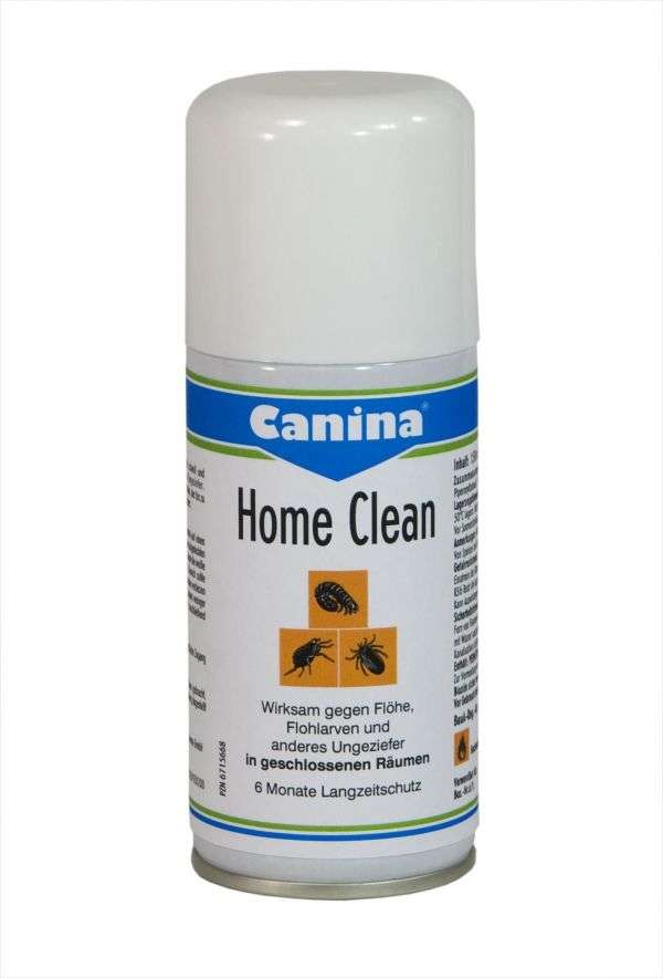 Wirksam gegen Flöhe, Flohlarven und anderes Ungeziefer Caninas Home Clean - der schnelle Tod für Läuse, Flöhe, deren Larven und Eigelege sowie anderes Ungeziefer in geschlossenen Räumen. Das in Caninas Home Clean enthaltene Permethrin tötet schnell und zuverlässig Flöhe und Flohlarven. Wirkungsweise: Der Langzeitschutz beruht auf der Wirkstoffkombination des Produktes , der bis zu 24 Wochen den Entwicklungszyklus der Flöhe bzw. des Ungeziefers verhindert. Inhalt: 150ml , Zusammensetzung: 1000ml enthalten: Permetrin 6,809g, Piperonylbutoxid 15,184g, Ethylalkohol 450g, Pyriproxifen 0,456g , Anwendung: Home Clean wird im Aufenthaltsraum der Tiere zentral auf einen erhöhten Platz gestellt, z.B. auf einen mit Zeitungspapier abgedeckten Tisch. Zuerst den weißen Kunststoffdeckel entfernen, dann die weiße Kunststofflasche hinunterdrücken, bis sie einrastet. Danach sollte die Tür des Raumes von außen geschlossen und für 2 Stunden nicht betreten werden. Der Inhalt von Home Clean entleert sich binnen weniger Minuten und reicht aus für ca. 60 qm bzw. 150 cbm. Anschließend eine halbe Stunde gründlich lüften. , Vorbereitung der zu behandelnden Räume: - Möglichst alle Räume behandeln zu denen Hund/Katze Zugang haben. - Außentüren und Fenster schließen. - Vor dem Einsatz sollten Vogelkäfige aus dem Raum gebracht, Aquarien und Terrarien abgedeckt und die Belüftung abgestellt werden. - Nahrungsmittel entfernen , Anmerkung: Während der Anwendung des Produktes nicht rauchen. Von Speisen und Getränken fernhalten. , Lagerungshinweise: In kühlen und gut belüfteten Räumen, nicht über 50°C lagern. Nicht zusammen mit anderen Chemikalien aufbewahren. Vor Sonnenstrahlung und anderen Wärmequellen schützen. , Hinweis: Enthält Permetrin. Zur Vermeidung von Umweltbelastungen das Produkt nur gezielt einsetzen. Biozide sicher verwenden. Vor Gebrauch stets Kennzeichnung und Produktinformationen lesen.