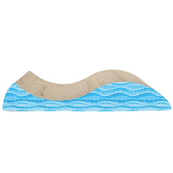 Dieses geriffelte Kratzbrett aus Pappe hat die Form einer Welle mit passendem Wellenmuster an den Seiten.