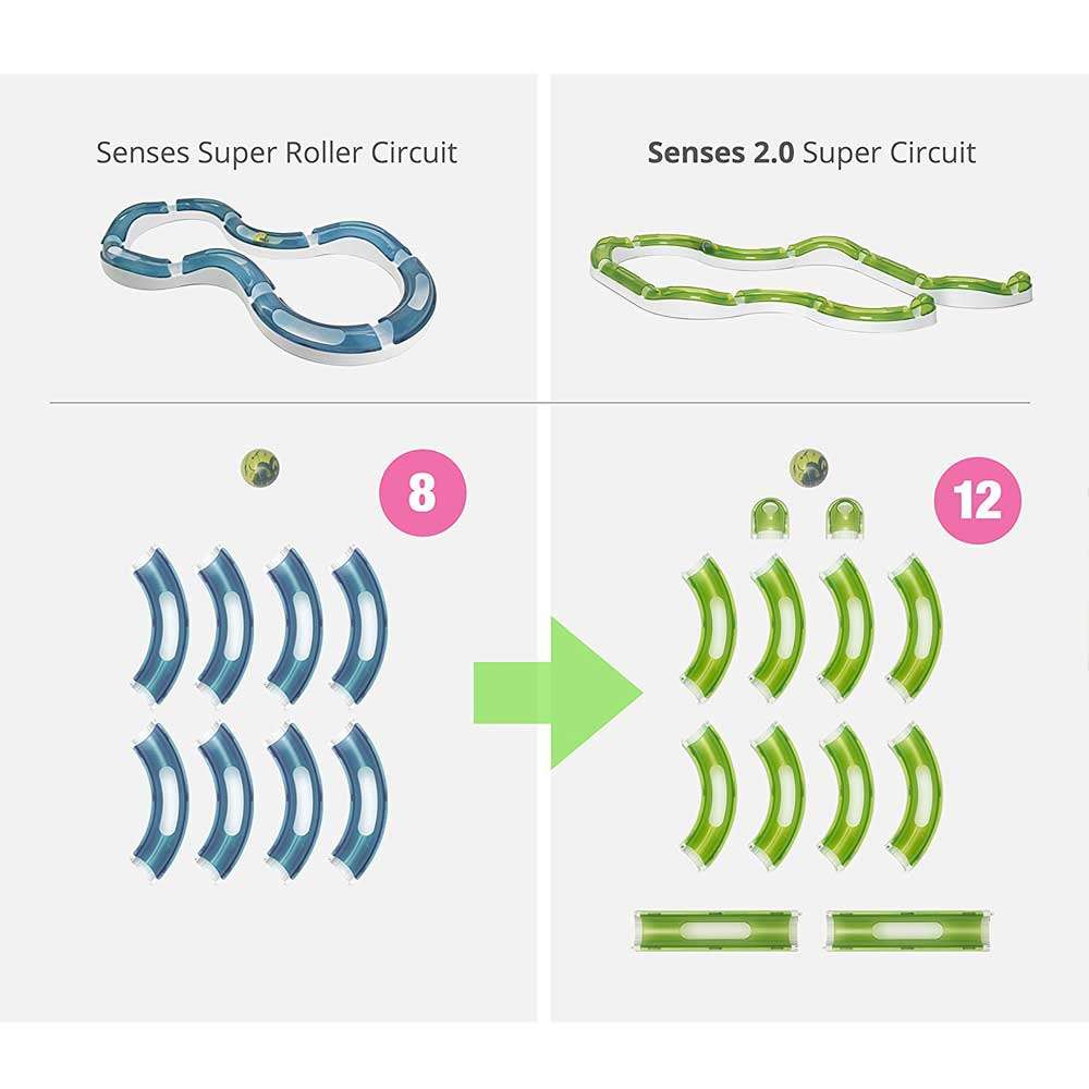 Die Spielschiene „Super“ ist die ultimative Kombination! Sie besteht aus 12 Elementen (2 Endstücke, 8 Kurvenelemente mit und ohne Erhöhung, 2 gerade Elemente) und einem Ball. Die Spielschiene ist kompatibel mit den neuen Senses 2.0 Produkten und 62 cm länger, als das vorherige Modell.