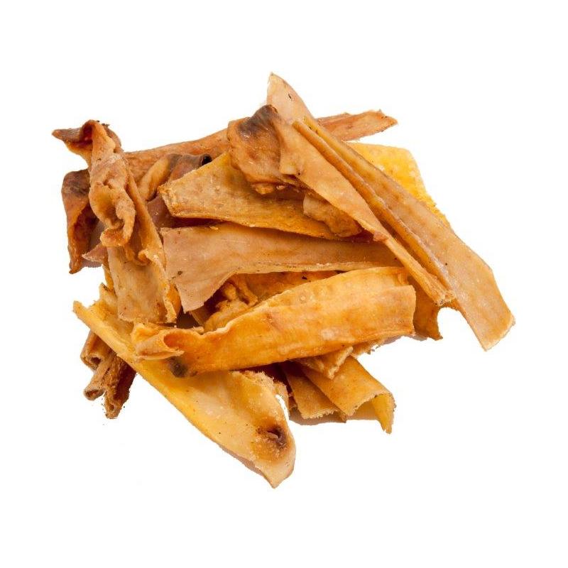 Knackige Streifen aus frittierter Schweinehaut ( Schweineschwarten ) . Ein natürlicher Kauspaß für jeden Hund.