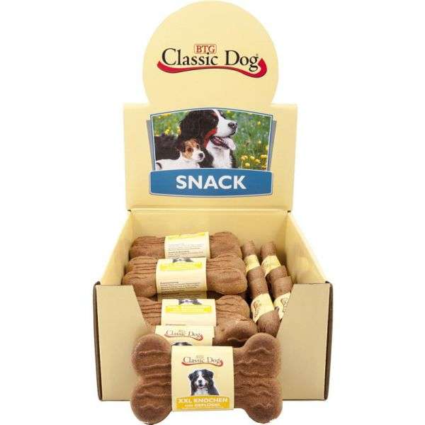Ergänzungsfuttermittel für große HundeDie Classic Dog XXL-Knochen sind die ideale Belohnung für große Hunde. Die knusprig gebackenen Kekse in Form eines Knochens dienen auch der optimalen Zahnreinigung Ihres Hundes. Hergestellt für: BTG Beteiligungs GmbH Gewerbestraße 5 - 7 42499 Hückeswagen Germany info@btg-systemlogistik.de www.classic-heimtiernahrung.de