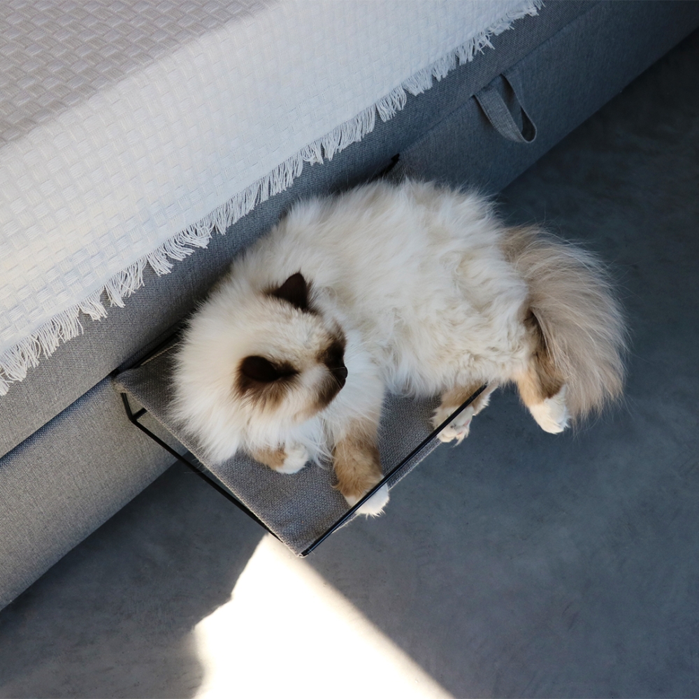 Katzen LIEBEN Hängematten, denn sie bieten eine sehr beruhigende, durchhängende Oberfläche, in der Katzen sehr gerne schlafen und sich ausruhen. OLIVER von D&D Home | I LOVE Happy Cats ist eine wunderschöne, moderne und minimalistische Heizungskörper- oder Boxspring-Hängematte, die diese Tatsache aufgreift und die in Zusammenarbeit mit der Katzenverhaltensforscherin Anneleen Bru entwickelt wurde. Die verstellbaren Klammern ermöglichen die Verwendung an den gängigsten Heizkörper- und Bettdesigns. Die Hängematte hat dank ihres Metallgestells eine robuste Struktur. Die Hängematte besteht aus einem attraktiven Innenstoff und kann mit Reißverschlüssen am Gestell befestigt werden (max. Gewicht 10kg). Und Katzen lieben es, in Ihrer Nähe zu schlafen. Wie cool ist es also, dass sie ihr eigenes Bett haben können, ganz in Ihrer Nähe! Suchen Sie nach anderen Hängematten? OLIVERS Bruder OTIS und Schwester OLIVIA passen an die Wand bzw. an das Fenster. Happy Tipp! Indem wir den bevorzugten Schlafplatz von Wildkatzen nachahmen, können wir Katzen dazu anregen, an bestimmten Plätzen zu schlafen und ihnen ein Gefühl der Sicherheit vermitteln. Oder legen Sie ein Handtuch in die Hängematte, an dem im Laufe der Zeit die Pheromone ihrer Katze haften, und benutzen Sie es beim nächsten Tierarztbesuch. Es vermittelt dann ein Gefühl der Sicherheit.