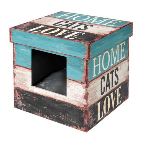 Diese Katzenbox wird durch ihr außergewöhliches Design zum Hingucker in jedem Stubentiger-Zuhause. Sie besteht aus 7mm dicker, extra stabiler Hartpappe. Der Innenraum und die Unterseite sind mit pflegeleichtem Kunstfasergewebe verkleidet. Der Deckel lässt sich selbstverständlich abnehmen. Lieferung erfolgt vollständig montiert und ohne Kissen. (einzeln bestellbar unter Artikelnummer: 671-427088-EBI)