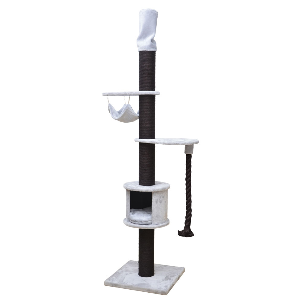 Der Kratzbaum hat alles was sich eine Katze wünscht: er ist robust dank der Befestigung zwischen Boden und Decke, man kann bis zur Decke klettern, die Sisalpfähle sind bis zu 15 cm dick, es gibt eine komfortable Hütte, 2 Plattformen, eine Hängematte oben und eine dicke Spielkordel.