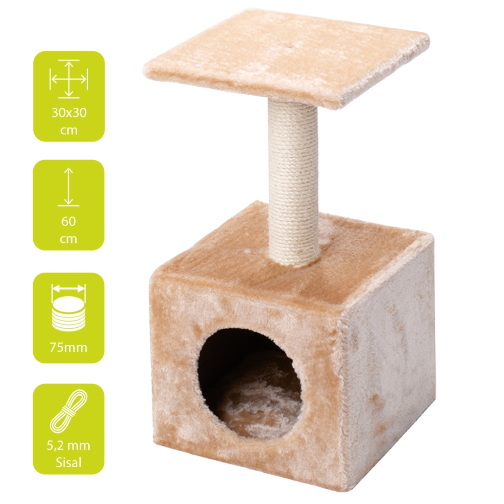 Der Kratzbaum Classic Abey ist ein kleiner, schöner Kratzbaum. Ihre Katze wird garantiert Freude an ihrem eigenen Zuhause haben. Ihre Katze kann nicht nur kratzen, sondern sich auch gemütlich auf der Liegefläche oder im Häuschen ausruhen. Sisal und Plüsch sind komplett verklebt.