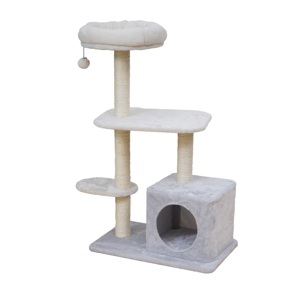 Für Katzen ist ein Kratzbaum sehr wichtig, um ihre Krallen zu pflegen und ihr Revier zu markieren. Der EBI Salinas Kratzbaum ist aus weichem Plüsch in Weiß und Grau gefertigt und verfügt über vier robuste, mit starkem Sisal umwickelte Kratzbäume. Auf dem Salinas befindet sich ein bequemer Korb, der sowohl als Sicht- als auch als Schlafplatz dienen kann. Außerdem ist der Kratzbaum mit einem Katzenhaus ausgestattet, das sowohl zum Verstecken als auch zum Ausruhen geeignet ist! Zu guter Letzt hängt an der Spitze ein kleiner Ball mit einer Glocke, mit dem Ihre Katze viel Spaß haben wird!