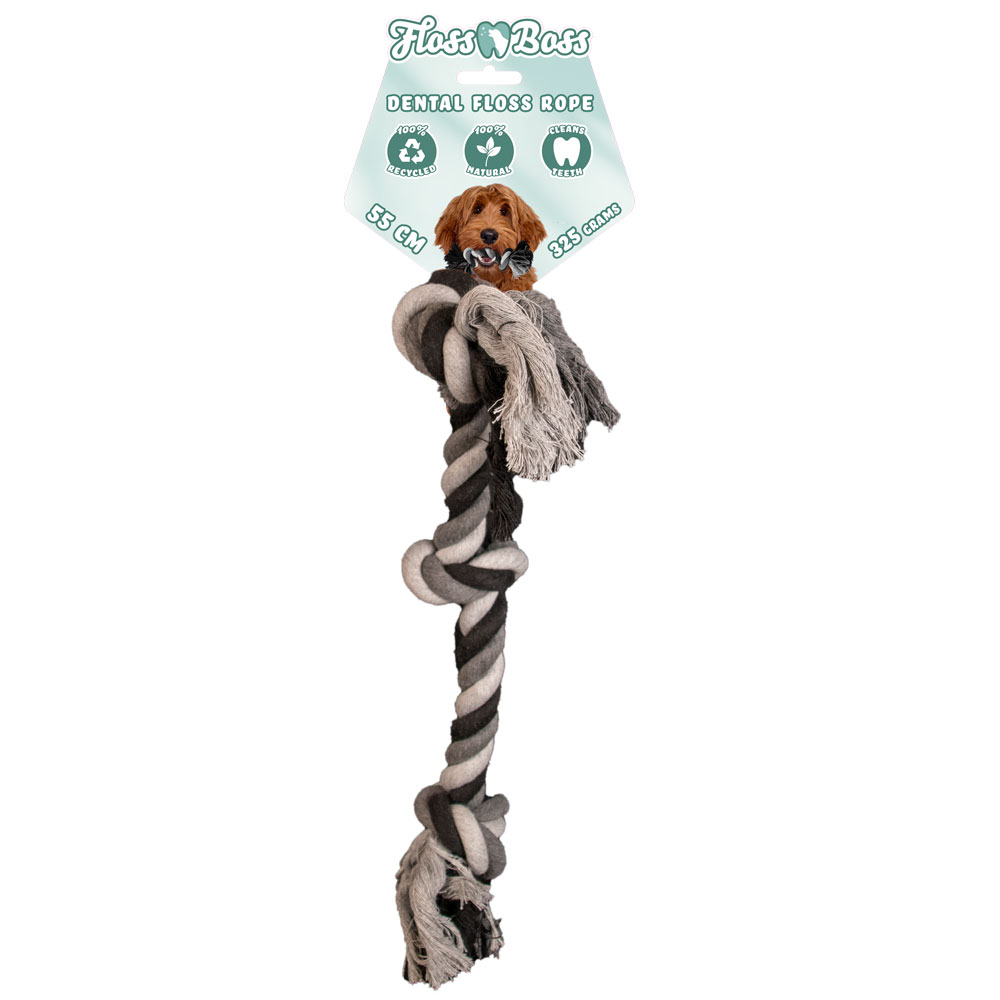 Dieses tolle Zahnseil hat nicht weniger als 3 Knoten und besteht aus 100% Baumwolle. Ideal für Apportier- und Zugspiele, sicher, natürlich und langlebig. Die Zahnseide hilft auch, die Zähne des Hundes beim Spielen zu reinigen. Dieses Floss Boss Zahnseil ist auch dichter geflochten und viel stärker als normale Zahnseide. Das liegt daran, dass nur ganze Fäden verwendet wurden.