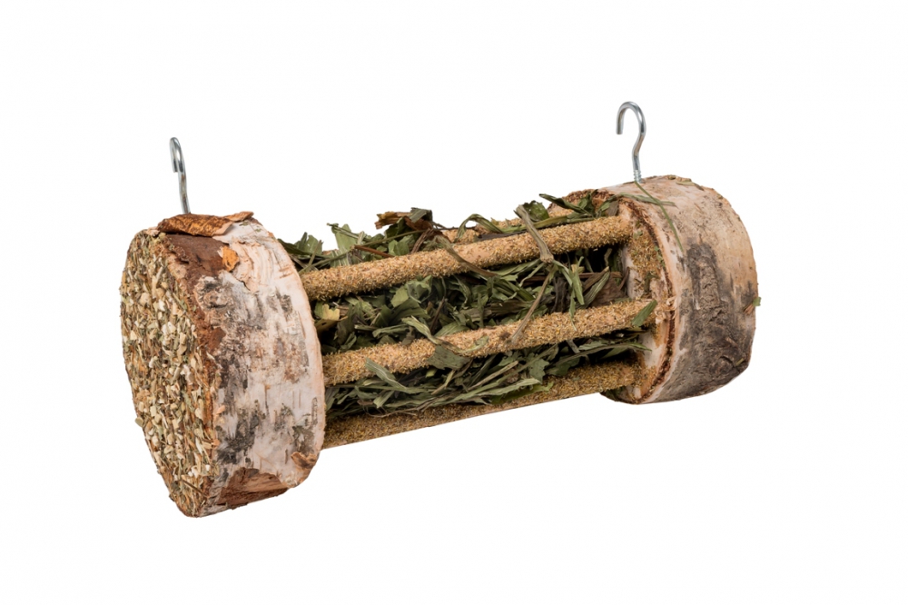 Holzrolle gefüllt mit Echinacea/Wegerich zum praktischen Einhängen im Käfig.