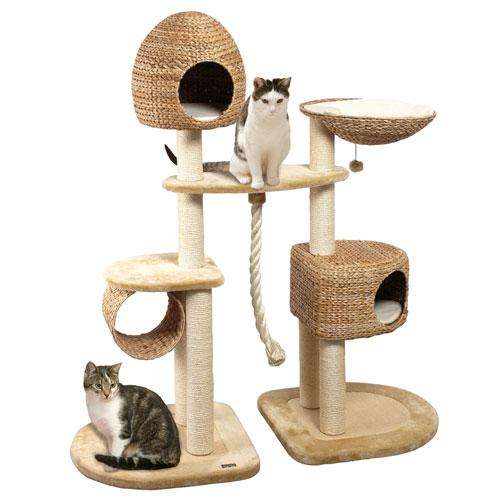 Banana Leaf - Das Original! Diese Schlafplatz- und Kratzbaumkombination in trendigem Design ist schon ein richtiger Spielplatz und bietet auch für zwei Katzen genug Platz zum Spielen und Schlafen. Durch besonders robuste Verarbeitung von Sisal und handgeflochtenen Bananenblättern wird diese Kombination Ihnen und Ihrer Katze lange Freude bereiten. Genug Kratzmöglichkeiten gibt es durch die mit Sisal umwickelten Säulen. Zwei kuschelige Höhlen und eine offene Rolle aus Banana Leaf laden ein zum Schlafen, Verstecken oder Ausruhen. Weitere Plattformen, ein herabhängendes Seil und ein Spielball lassen keine Langeweile aufkommen, diese Kratzbaumkombination bietet unendlichen Spiel- und Kletterspaß.