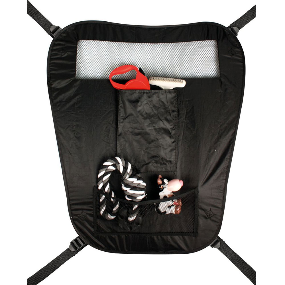 Durch den Sicherheitsschutz verbleibt Ihr Hund sicher auf dem Rücksitz. Da Ihr Hund nicht auf die Vordersitze springen kann, vermeiden Sie gefährliche Situationen und sogar Unfälle. Die Barriere besitzt einen Netzeinsatz, sodass Sie oder Ihr Beifahrer sehen können, was auf dem Rücksitz geschieht. An der Vorderseite befinden sich zwei zusätzliche Staufächer. Mit den verstellbaren Gurten können Sie den Schutz ganz einfach an der Rückseite der Vordersitze befestigen.