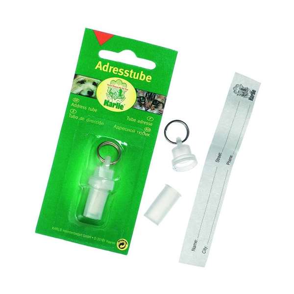 Adresstube für Hunde und Katzen aus Kunststoff, im Innern mit einem aufgerolltem Zettel zum Vermerken der Adresse. Mit Ring zur Befestigung am Halband oder Geschirr.