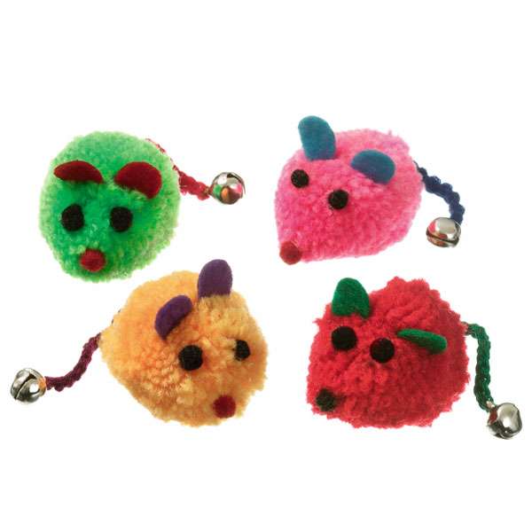 Die vier bunten Pompom-Mäuse eignen sich toll zum stundenlangen Spielen und Jagen. Sie sind mit Glöckchen und Catnip-Duft ausgestattet.