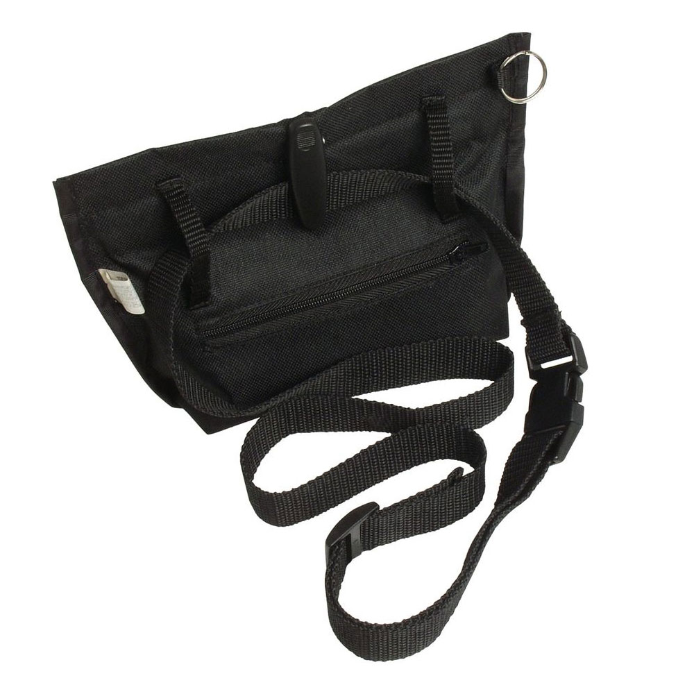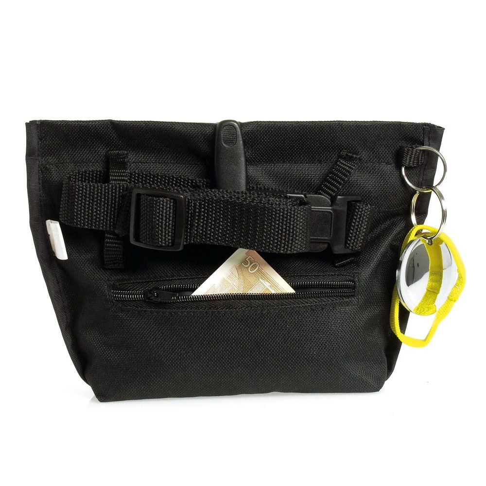 Mit praktischer Metallbügel-Öffnung. Komplett mit Bauchgurt verstellbar. Mit Gürtel/Taschenclip, Handytasche, kleiner Tasche mit Reißverschluss und Schlüsselring zum Befestigen von z.B. Clicker, Discscheiben etc. Strapazierfähiges Nylonmaterial. Mit reflektierendem Streifen zur Sicherheit. Größe: ca. 19 x 22 cm. Farbe: Schwarz.