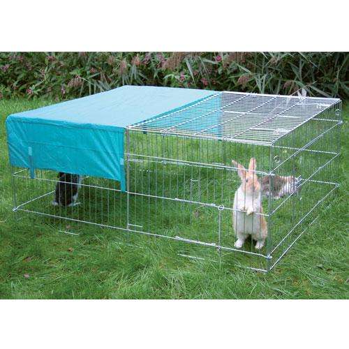 Dieses verzinkte Freilaufgehege für große Kaninchen und Hasen erhalten Sie inklusive Sonnenschutz. Die Gitterabdeckung verhindert ein Herausspringen der Tiere und bietet optimalen Schutz vor ungebetenen Gästen, wie Greifvögeln, Katzen oder Mardern. Das Gehege ist seitlich mit einer Tür und einer zusätzlichen kleinen Öffnung (z. B. zur einfacheren Fütterung) ausgestattet und lässt sich außerdem von oben öffnen. Die Befestigung erfolgt mit Erdspießen im Boden. Einfache Montage!