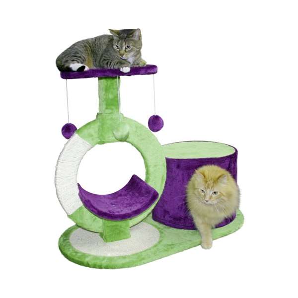 Der zweite Liegeplatz befindet sich in Form einerArt Liegemulde im Inneren des Kreises, der mit Plüsch bezogen und teils Sisal umklebt ist. Diese Liegemulde hat eine Größe von ca. 26 x 27 cm. Eine zweite Sisalfläche zum Krallenschärfen befindet sich auf der Bodenplatte. Und auch für Spielspaß soll natürlich gesorgt sein: vier Plüschbälle, die von der obersten Liegefläche herunterbaumeln regen zum Spielen und Jagen an.