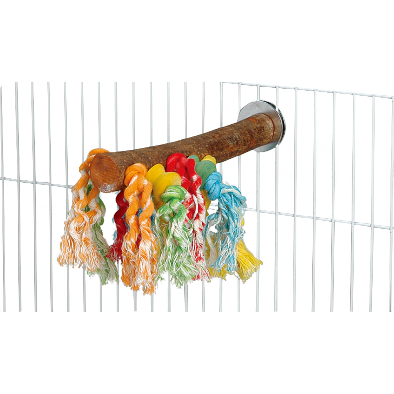 Die Sitzstange weckt mit ihren bunten Farben und den verschiedenen Materialien, wie Holz und Seil das Interesse bei jedem Papagei und Sittich.