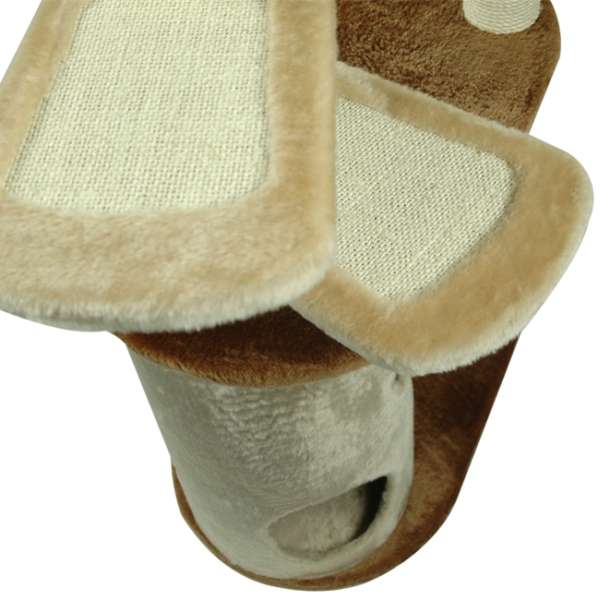 Weitere Besonderheiten sind die beiden Platten, die Treppenstufen ähneln. Diese sind mit Sisalflächen bestückt, die neben den Sisalstämmen eine super Gelegenheit bieten, um den natürlichen Instinkt des Krallenwetzens zu befriedigen. Auch das Dach der mittleren Höhle ist komplett mit Sisal umwickelt. Eine Rolle, die mit weichem Plüsch bezogen ist, in der Mitte des Kratzbaumes rundet das Bild noch ab.