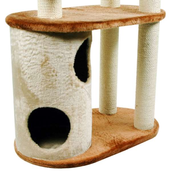 Cairo begeistert nicht nur durch sein außergewöhliches Design, das an eine Burg erinnert, sondern vorallem durch seine drei Höhlen, von denen eine nochmal in zwei getrennte Etagen unterteilt ist, und durch seine vielfältigen Spiel- und Kratzmöglichkeiten. So hat der Kratzbaum zum Beispiel neben den Sisalstämmen, die ja für Kratzbäume nichts außergewöhliches sind, noch drei Plüschstämme, von denen zwei mit integrierten Spielzeugen bestückt sind. Im vorderen der beiden beigen Plüschstämme sind zwei weiße Spielmäuse eingebaut, die mit einem Rasseleffekt versehen sind, im braunen Plüschstamm, der sich ganz oben auf der Burghöhle befindet ist sogar ein Plüschball mit Soundchip vorhanden. So ist ein toller Spielspaß schon vorprogrammiert!