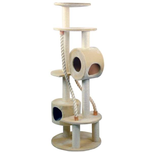 Der Kratzbaum Cleo eignet sich für kleine, leichte Katzen. Er besteht aus einer runden Bodenplatte mit einem Durchmesser von ca. 60 cm, acht Sisalstämmen, die 8 cm dick sind, insgesamt vier Platten und zwei gemütlichen Höhlen zum Zurückziehen. Toll zum Klettern und Spielen sind die beiden extra dicken Seile, die einen Durchmesser von ca. 4 cm haben.
