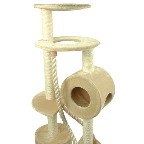 Die oberste Liegefläche hat einen Gesamtdurchmesser von ca. 40 cm und besitzt eine integrierte Liegemulde mit einem Durchmesser von ca. 25 cm. Die runde Platte darunter ist mit einem Durchgangsloch versehen, durch welches die Katze nach oben gelangt. Die gesamte Platte hat einen Durchmesser von ca. 48,5 cm, das Durchgangsloch besitzt einen Durchmesser von ca. 22 cm. Die untere Höhle des Kratzbaumes hat einen Durchmesser von ca. 35 cm, eine Höhe von ca. 25 cm und besitzt ein Eingangsloch mit einem Durchmesser von ca. 17,5 cm. Die obere Höhle ist mit zwei Ein-/Ausgängen versehen, wobei der Fronteingang ca. 17,5 cm, der Seiteneingang ca. 16,5 cm groß ist. Der Durchmesser der Höhle selbst beträgt ca. 34,5 cm, die Tiefe beträgt ca. 25 cm.