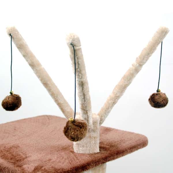 Der Kratzbaum ist mit insgesamt fünf Spielbällen mit Glöckchen an Gummibändern ausgestattet. Da wird sicherlich keiner Katze so schnell langweilig. Es ist zwar unter der Höhle auch ein üblicher Sisalstamm vorhanden, als ideale Kratzgelegenheit bieten sich aber selbstverständlich die beiden Kratzbretter an, auf denen die große Liegeplatte befestigt ist. Bei den Kratzbrettern handelt es sich um stabile Platten, die eine Dicke von über 5 cm haben, teils mit beigem Plüsch bezogen sind und mit Sisal-Kratzflächen mit Maßen von ca. 14 x 55 cm bestückt sind. Ideal also, um dem Kratzinstinkt nach Herzenslust nachzugehen.