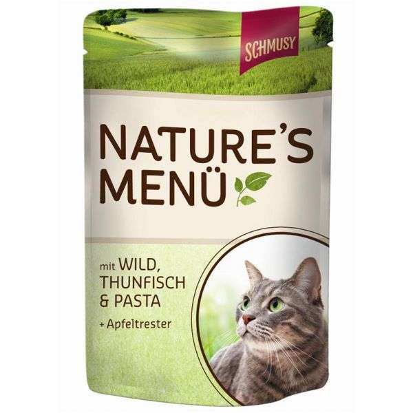 Die funktionelle Zutat in SCHMUSY NATURES MENÜ mit Wild, Thunfisch & Pasta ist Apfeltrester mit Ballaststoffe für die gesunde Magen-Darm-Passage.