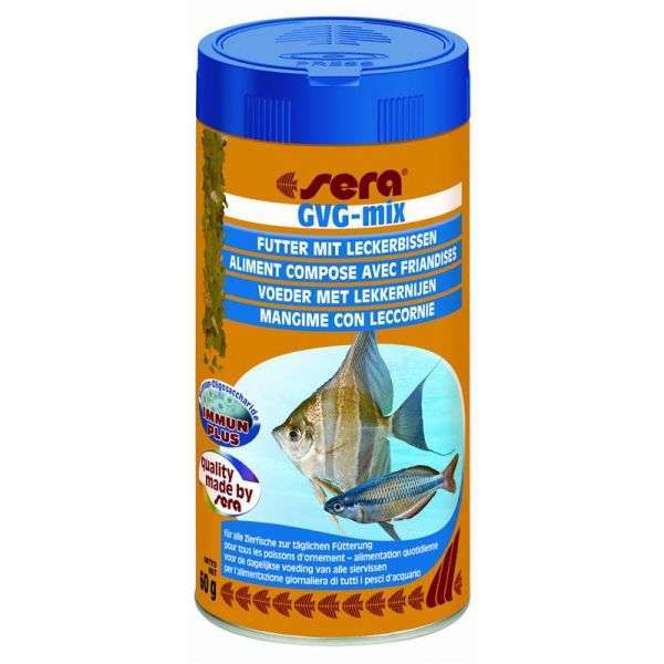 sera GVG-mix besteht zu 80 % aus einer Spezialflocke, die aus Meeresalgen, gemahlenem Krill und Plankton hergestellt wird. 20 % bestehen aus gefriervakuumgetrockneten (GVG, FD) Mückenlarven, Daphnien und Artemia-Shrimps.