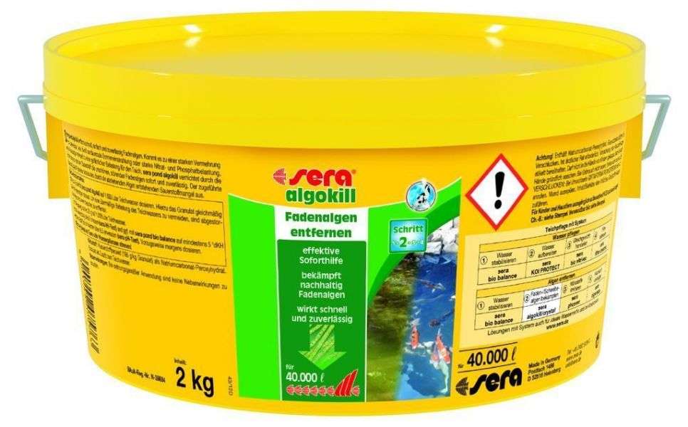 Durch die Freisetzung von aktivem Sauerstoff werden Fadenalgen nachhaltig zerstört. Zudem wird der durch absterbende Algen im Teich entstehende Sauerstoffmangel durch sera pond algokill* ausgeglichen. sera pond algokill* wird direkt auf die Algenmatten aufgestreut. Das Produkt wirkt dann sofort und effektiv am Problemort.