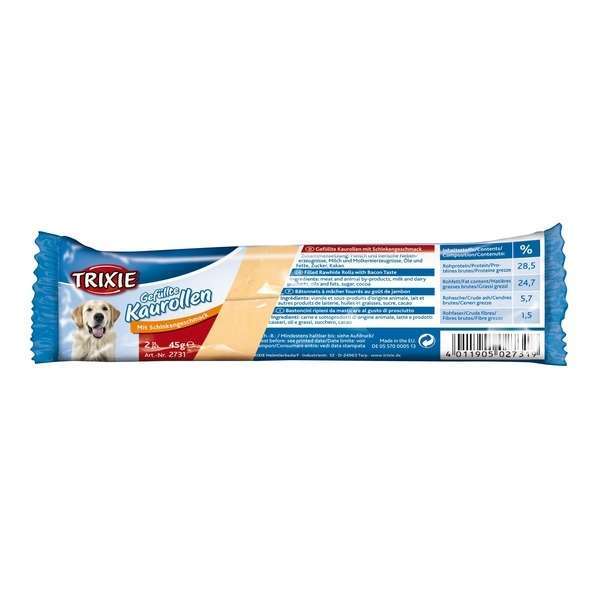Diese Kaurollen des Herstellers Trixie bestehen aus Rinderhaut und haben eine schmackhafte Schinkenfüllung.