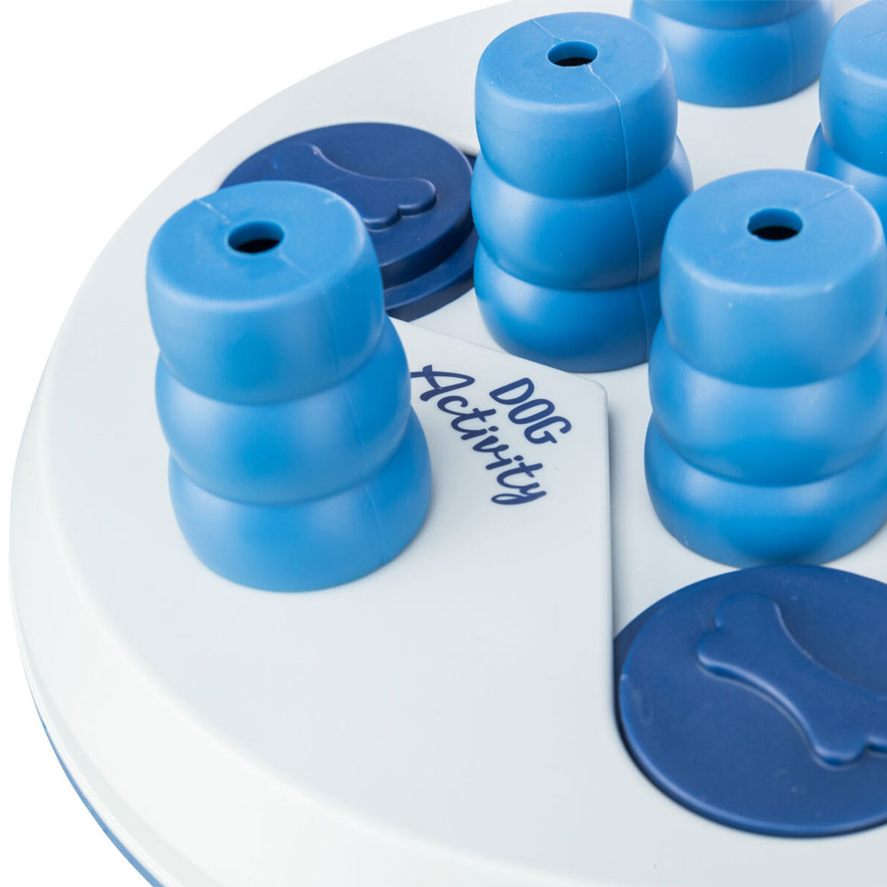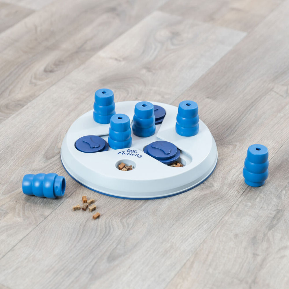 Um den Schwierigkeitsgrad zu erhöhen, kannst du die Kegel als Stopper zwischen die Abdeckungen setzen und auch hier Leckerlis verstecken. Dein Vierbeiner muss verstehen, dass er erst die Kegel umstoßen muss, bevor er die Abdeckungen verschieben kann. Nach dem Spielen kann das Dog Activity-Spielzeug in der Spülmaschine gereinigt werden.