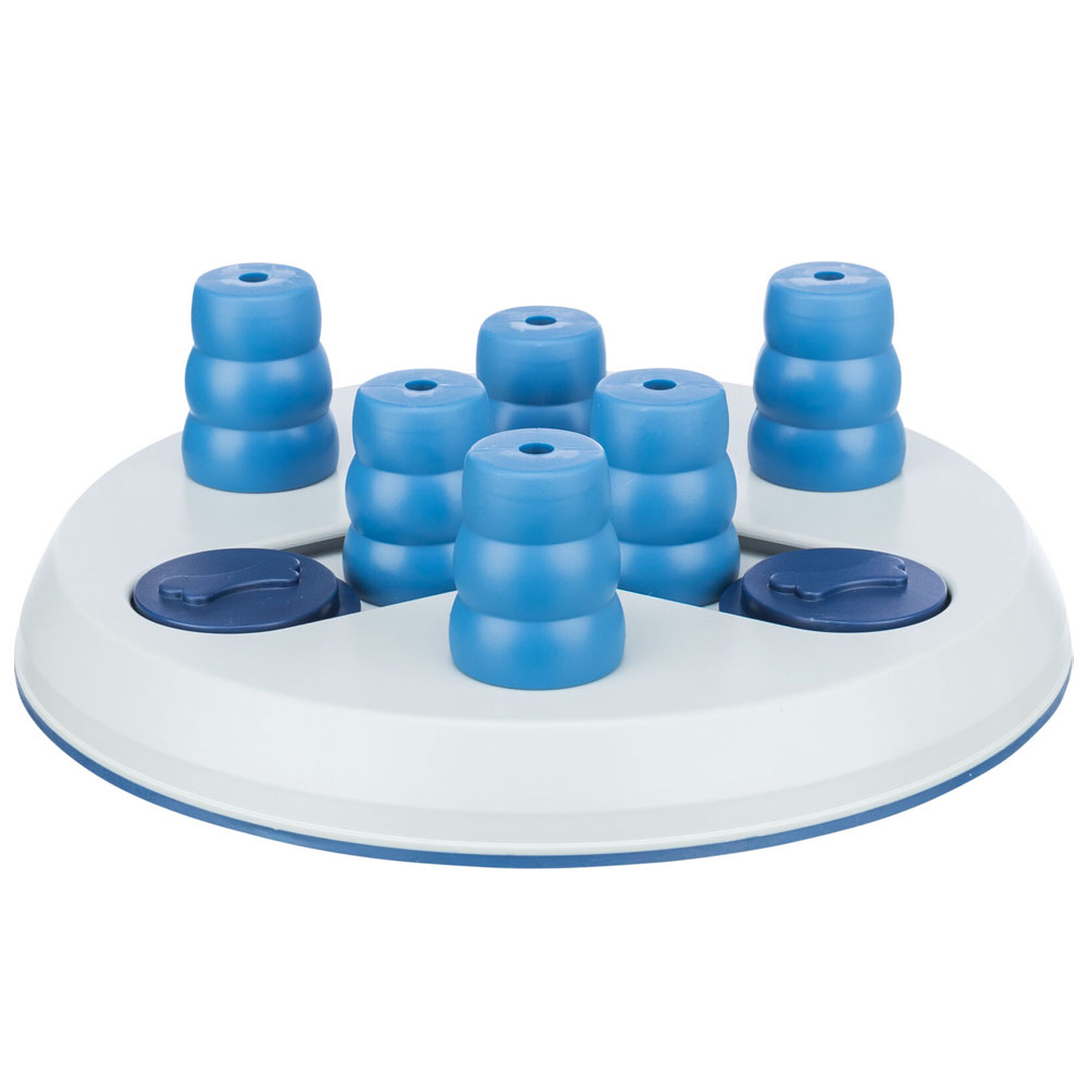 Möchtest du die Beziehung zu deinem Hund stärken? Das „Slide & Fun Board“ ist ein Strategiespiel für Vierbeiner aller Altersklassen und sorgt für großen Spielspaß zwischen Hund und Halter. Das Brettspiel hat Kegel und Vertiefungen mit Schiebedeckeln, die bewegt werden müssen. Nachdem du die Vertiefungen mit Snacks befüllt hast, soll dein Hund diese aufspüren und verschiedene Öffnungstechniken anwenden, um an seine Belohnungen zu gelangen.