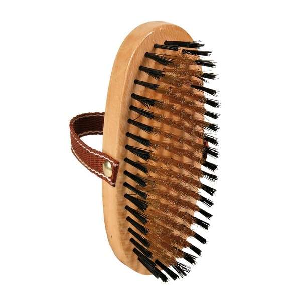 Die Bürste hat einen Rücken aus Holz und Borsten aus Messing und Nylon. Mit Handschlaufe.