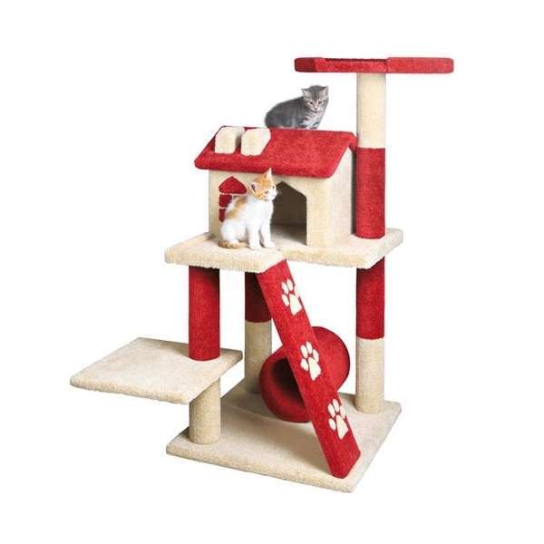 Der Trixie Kratzbaum Antonia ist komplett, sowohl außen als auch im Inneren der Höhle mit Teppich bezogen. Die lange Schräge mit den Pfotenmotiven dient als Kratzfläche, an der sich die Katze mal richtig strecken kann. An der Bodenplatte ist eine Spielrolle befestigt. Das große Haus stellt eine gemütliche Rückzugsmöglichkeit dar und auch für bequeme Liegeplätze ist gesorgt.