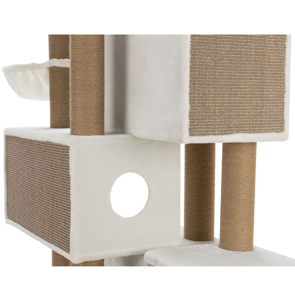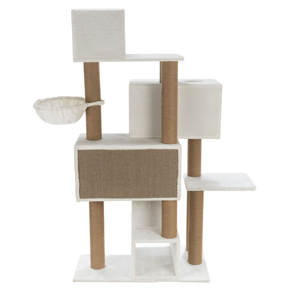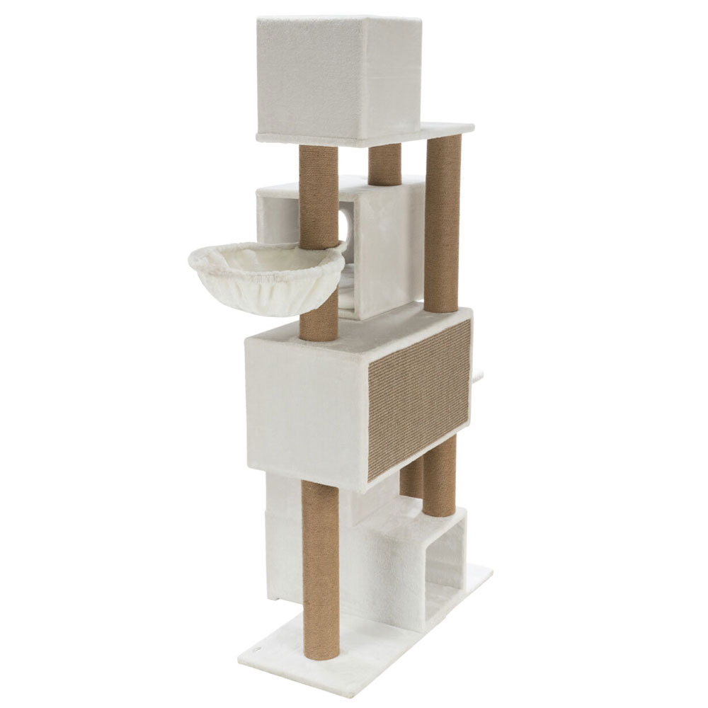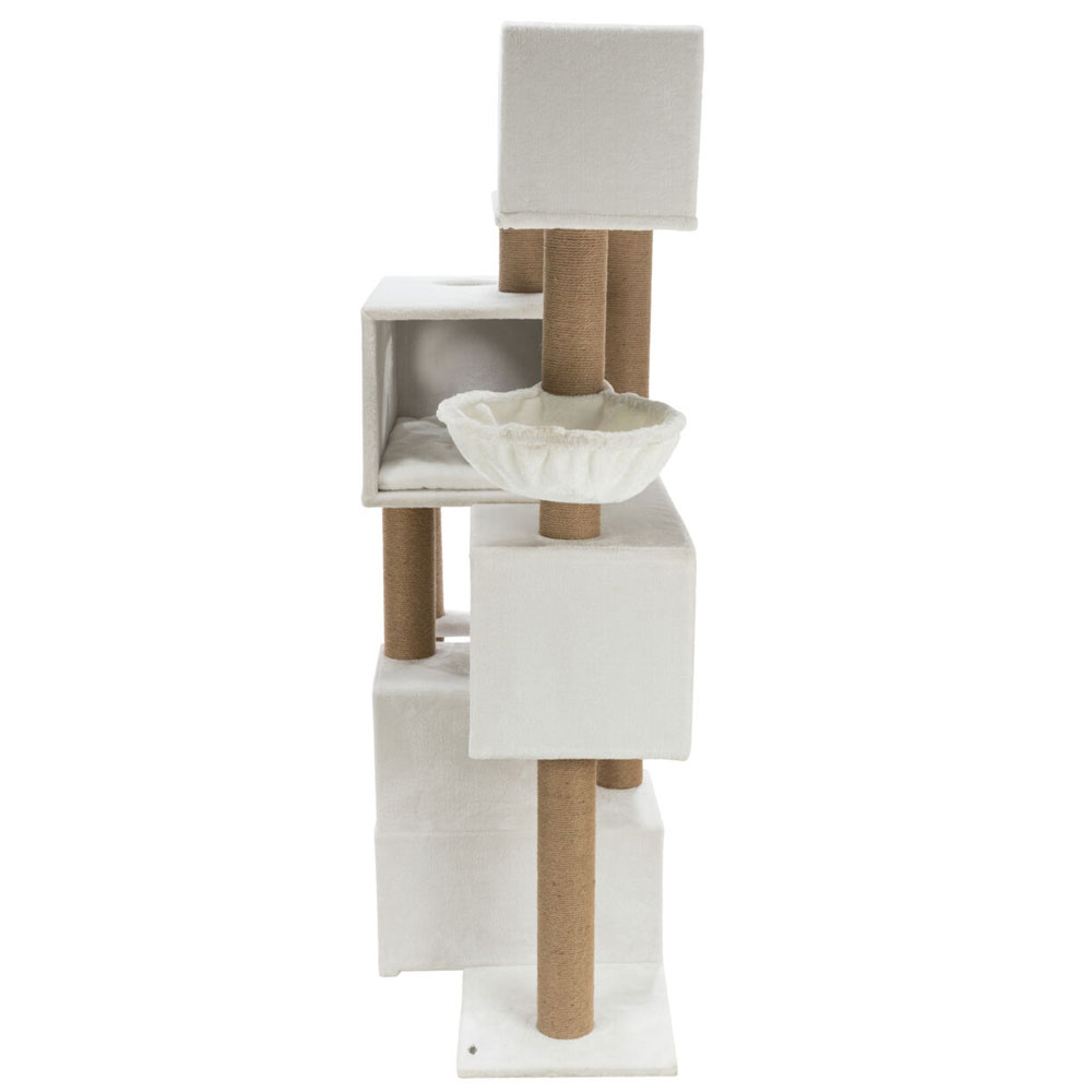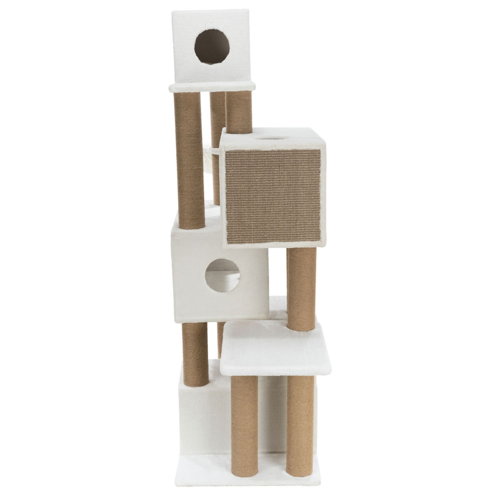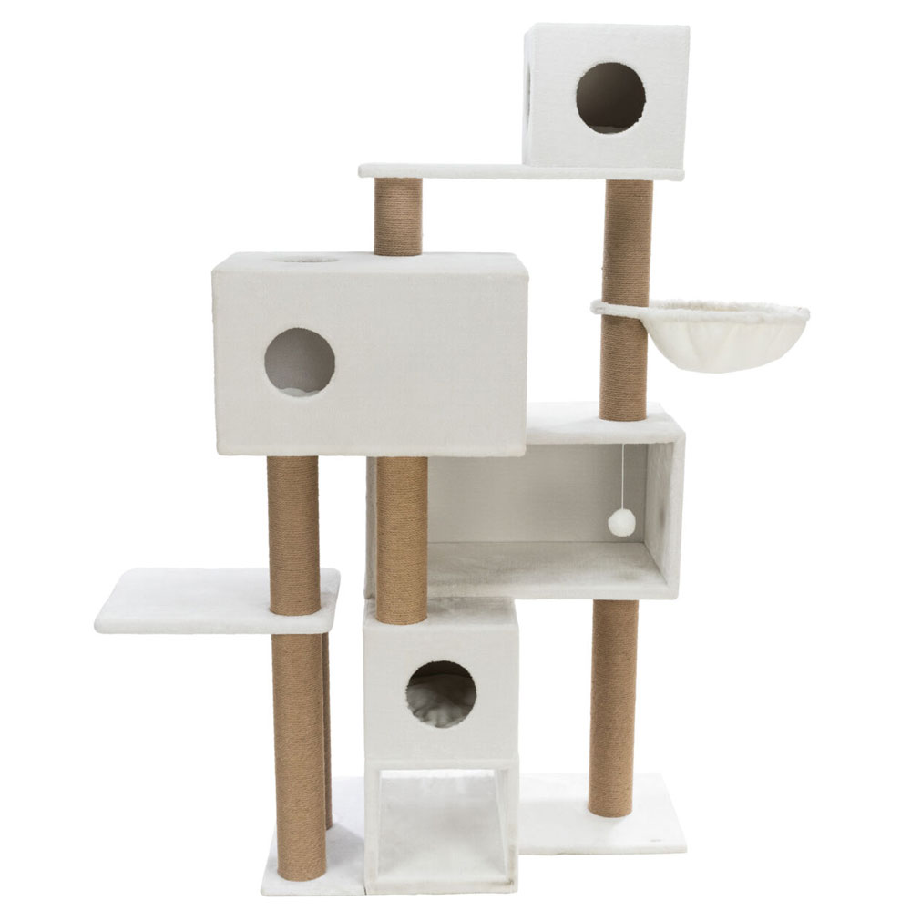 Der als Raumteiler nutzbare Kratzbaum Catarina bietet gleich mehreren Stubentigern genügend Platz zum Ausruhen, Klettern und Spielen. In den mit weichem Plüsch und Fleece bezogenen Höhlen auf unterschiedlichen Ebenen können sich deine Katzen ausruhen, verstecken und durch gleich mehrere Öffnungen Ausschau halten. Die Höhlen sind mit Wendekissen ausgestattet, welche per Handwäsche gereinigt werden können. Auch der stabile Kuschelsack ist bestens zum Ausruhen geeignet. Die mit Jute ausgestatteten Kratzstämme und die zwei Sisalkratzflächen an den Außenseiten bieten deinen Samtpfoten diverse Kratz- und Klettermöglichkeiten, zur zusätzlichen Beschäftigung ist ein Spielball aus Plüsch am Kratzbaum befestigt.
