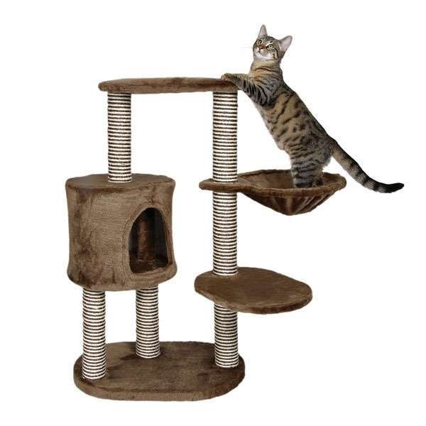 Der Trixie Kratzbaum Moriles fällt besonders durch seine farblich geringelten Stämme auf, die mit Natursisal umwickelt sind.