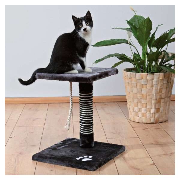 Der Trixie Kratzbaum Viana ist ca. 44 cm hoch. Insgesamt besteht er aus einer Bodenplatte, einem Sisalstamm mit Plüschrand, einer Liegeplatte und einem Spielseil.