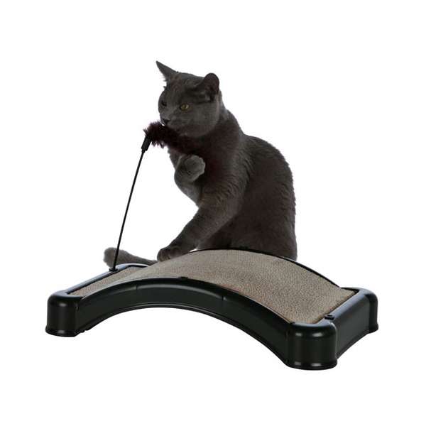 Die neue Kratzbrücke vom bekannten Hersteller Trixie besteht aus einem schwarzen Kunststoffrahmen mit einer austauschbaren besandeten Kratzpappe. Durch Gummifüße wird ein Verrutschen der Kratzbrücke vermieden. Das Spielzeug, welches an einer Spielangel befestigt ist, ist variabel platzierbar. Mit Catnip.