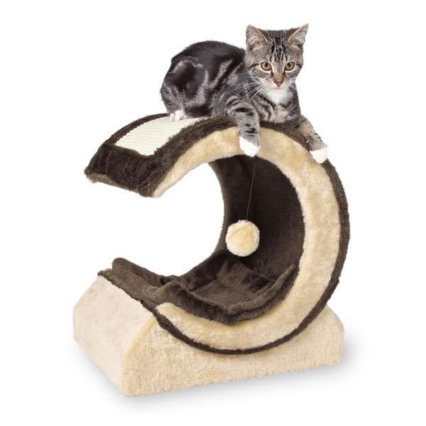 Der beige-braune Kratzmond ist mit weichem Plüsch bezogen und mit einer Sisalkratzfläche ausgestattet. Der Innenteil des Mondes ist mit einem herausnehmbaren Kuschelkissen bestückt und stellt so einen gemütlichen Ruheort dar. Ein Spielzeug am Gummiband sorgt für Beschäftigung und Spielspaß. Das Kissen kann bei 30°C per Handwäsche gereinigt werden.