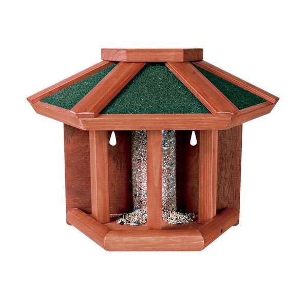 Mit dem halbrunden Futtersilo aus lasiertem Kiefernholz erfreuen Sie die Vögel im Winter mit trockenem und sauberem Futter. Die große Landefläche bietet ausreichend Platz für mehrere Vögel, die unter dem Dachüberstand in Ruhe fressen können.